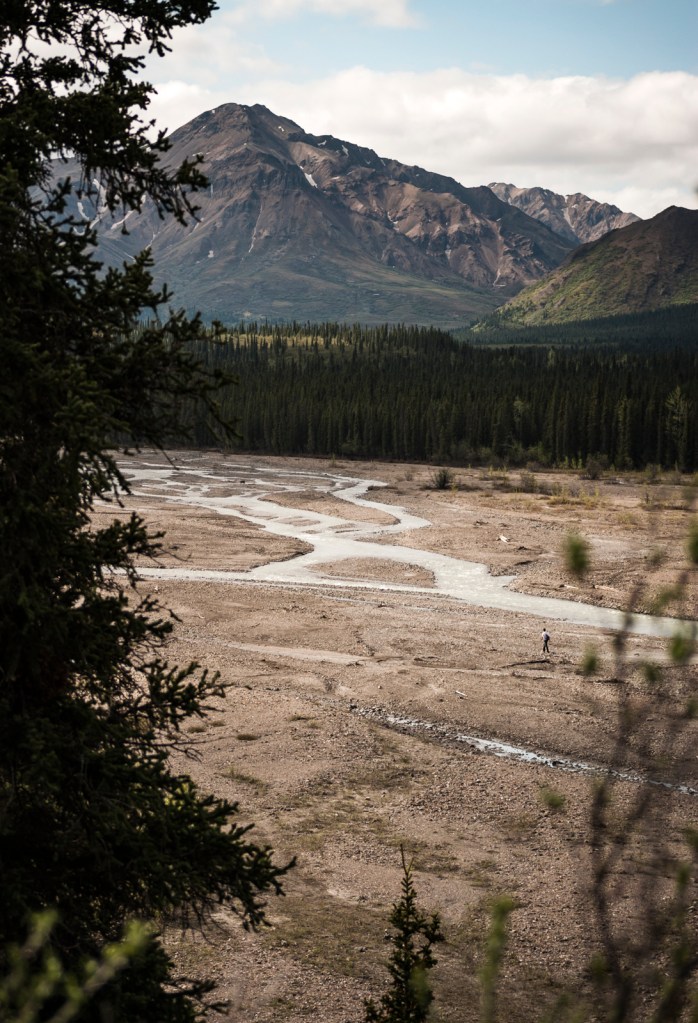 On the 85 mile park road in Denali, there are several turnouts and rest stops for the visitors to take advantage of. One rest stop in particular stands out to me. Coming up to the stop I hadn’t thought much about it other then being able to get off the bis and walk around. But after being off the bus for a bit I had noticed that the guy that had been sitting behind on the bus was now walking down the river wash. Knowing that its not a big deal for people to decide to get of the buses and go for hikes I at first didn’t think much of it. But knowing that he didn’t really have much for gear or protective clothing I did start to wonder what he was doing. I had noticed while on the bus he had a small shoulder bag made from yarn, one like your grandma would make for you, with a few odd and ends in it, along with not having a jacket. But when I saw him walking down the rive wash I thought to myself, “another McCandless?” I hurried out to a spot for this shot before we had to board and leave.