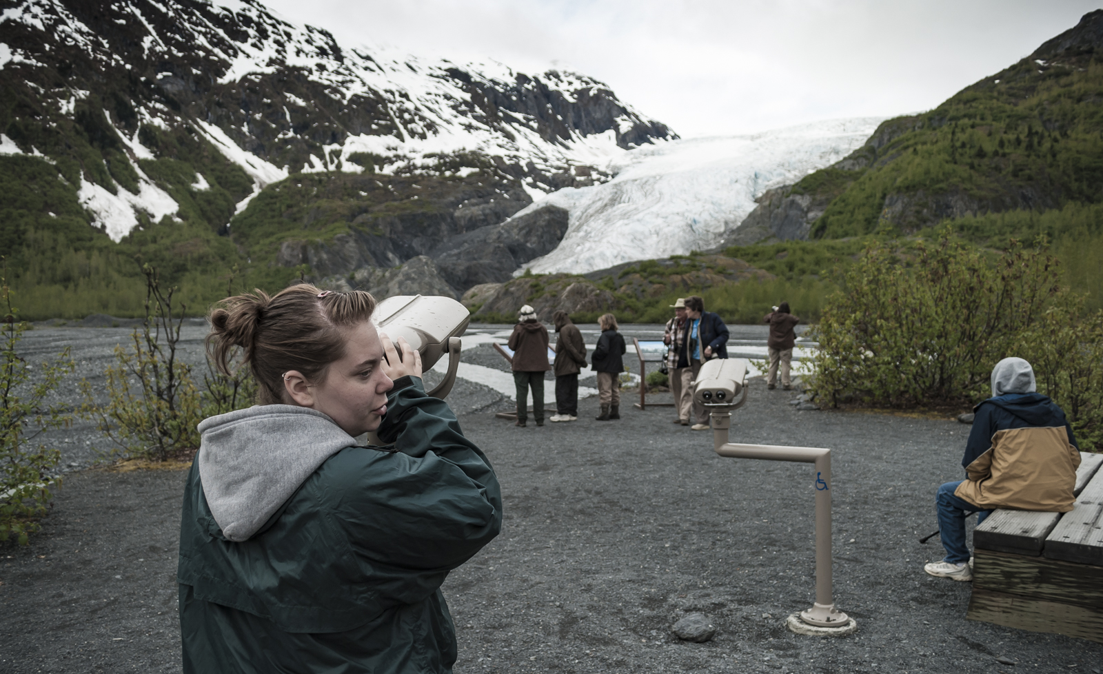 On this trip I traveled with my mom and niece, here we are out visiting Exit Glacier. My mom taking a break on the bench while my niece was checking out Exit via the telescope.