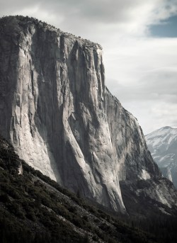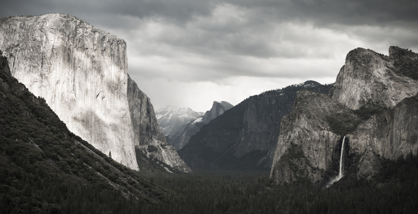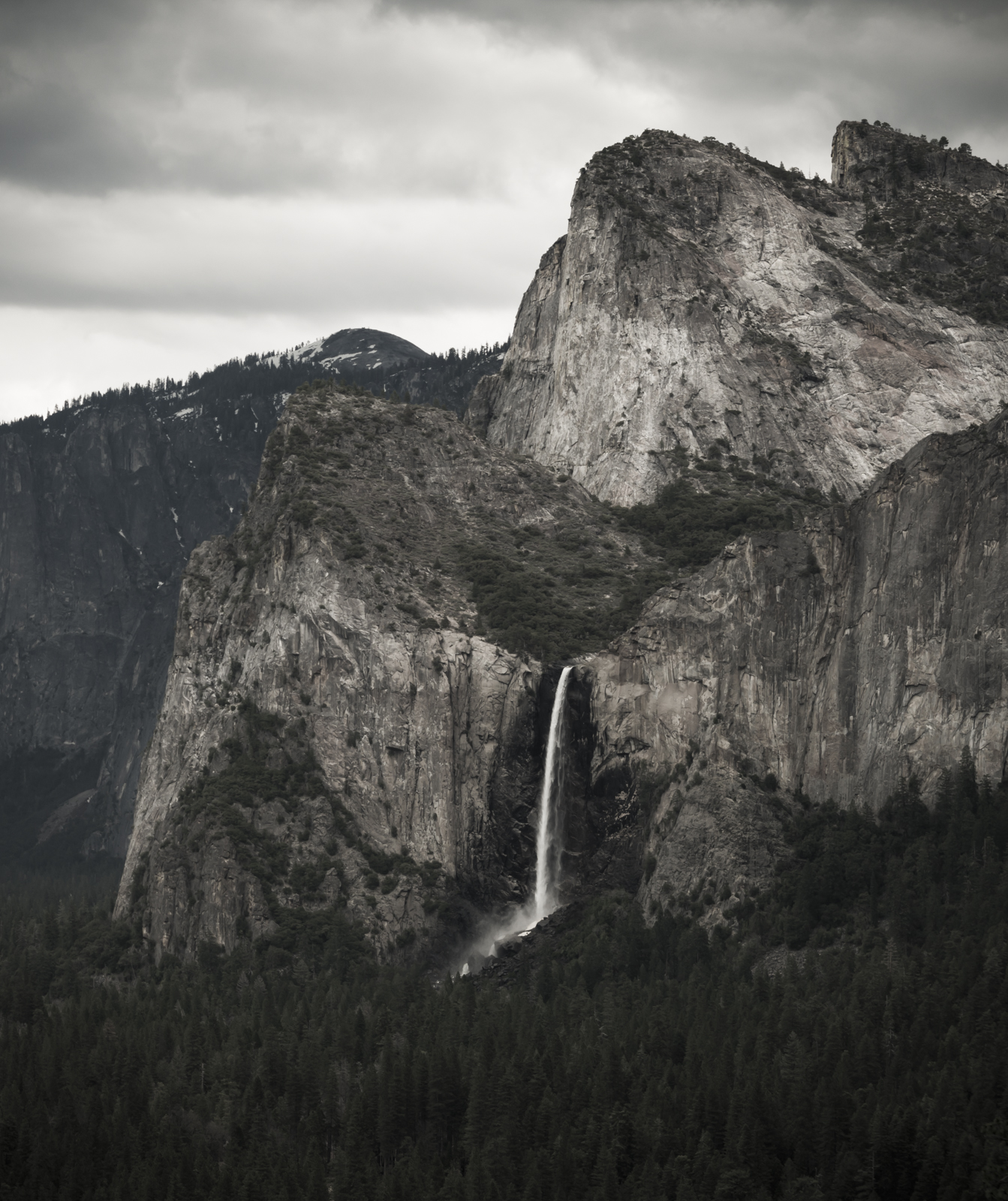 On the way into Yosemite Valley, there is a pull-out on HW-41, called Tunnel View, it is just after the tunnel. The image of El Capitan is from the morning of my very first visit to Yosemite Valley. On the left side is the view of El Captain and on the right is Bridal Veil Falls, taken on a different day, working together they frame the valley that stretches seven and half miles to the east.
